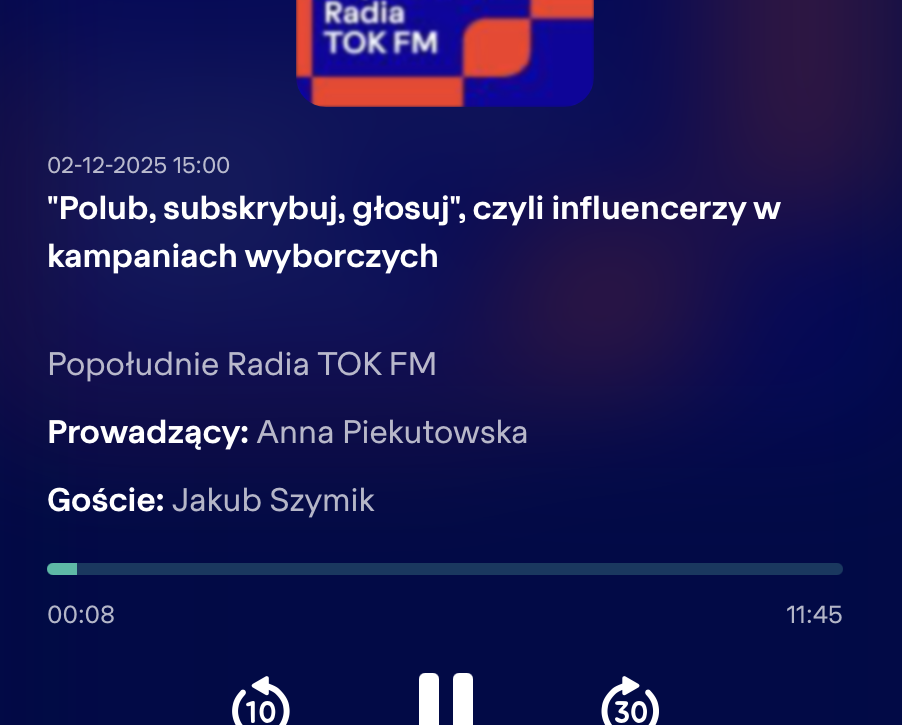 W audycji Popołudnie Radia TOKFM rozmawialiśmy dziś z Anną Piekutowską o naszym najnowszym raporcie "Polub, udostępnij, głosuj". Jak wskazała prowadząca, liczne przykłady intensywnego zaangażowania influencerów w kampanie wyborcze w Europie Środkowo-Wschodniej udowadniają pilną potrzebę zapewnienia wyborcom możliwości rozróżnienia między płatnymi współpracami a niezależnymi wypowiedziami. Poruszyliśmy także kwestię zapisów obecnych w Europejskiej Tarczy Demokratycznej, konieczności…