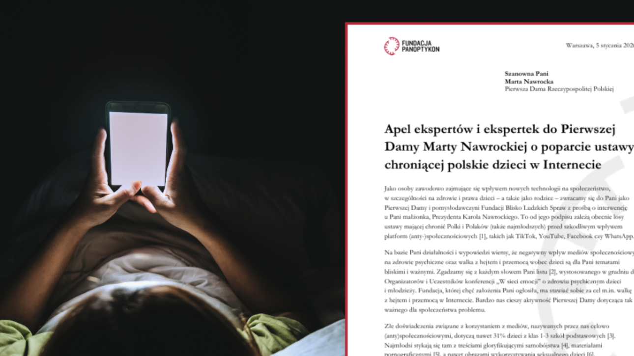 Fundacja Panoptykon wystosowała list do Marty Nawrockiej o poparcie ustawy wdrażającej Digital Services Act (DSA) w Polsce. Autorzy zwrócili uwagę na drogi dla Pierwszej Damy problem ekspozycji dzieci na niebezpieczne treści, mechanizmy uzależniające oraz hejt w sieci.